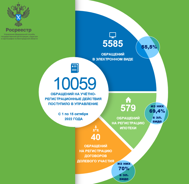 Управление Росреестра по Белгородской области информирует о количественных показателях в учетно-регистрационной сфере за период с 1 по 15 октября 2022 года В указанный период в Управление Росреестра по Белгородской области поступило 10059 обращений на учётно-регистрационные действия, 55,5 % из которых направлены в электронном виде (5585). Число поданных обращений на регистрацию ипотеки за отчетный период составило 579. Из общего количества поданных обращений 69,4 % поступили в Управление в электронном виде (402). Количество поступивших на регистрацию договоров долевого участия (ДДУ) составило 40. В электронном виде подано 70 % от общего числа таких обращений (28). #Росреестр #РосреестрБелгород #СтатистикаУправления #Управлениевцифрах #новостиРосреестра