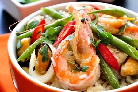 рис (индика) — 1 стак. кальмар — 1 шт креветки — 100 г мидии — 150 г фасоль стручковая (или молодой горох в стручках) — 100 г имбирь (кусочек - 2 см) чеснок — 1 зуб. лук белый — 0,5 шт морковь — 1 шт соевый соус — 2 ст.л. уксус (рисовый 3-4 ст.л. ) соус (рыбный если есть) — 1 ст.л. перец чили перец черный (молотый ) кинза (или петрушка - несколько веточек для подачи ) масло оливковое — 6 ст.л. рыба (белая) — 200 г масло кунжутное — 1 ч.л. сахар коричневый — 1 ч.л. Стакан риса промыть, отварить до готовности. Кальмара и креветки разморозить, мидии очистить от ракушек, форель выпотрошить. Рыбу разделать на филе. Плов с рыбой и морепродуктами ингредиенты Кальмара очистить от пленки, нарезать на кольца. У креветок очистить хвостовую часть, панцирь и хвостик оставить. Надрезать хвост посередине и удалить кишечную вену. Удалить плавники у форели, нарезать одинаковыми полосками. Овощи помыть, обсушить. Лук нарезать полукольцами, морковь соломкой. Фасоль очистить от хвостика, есл