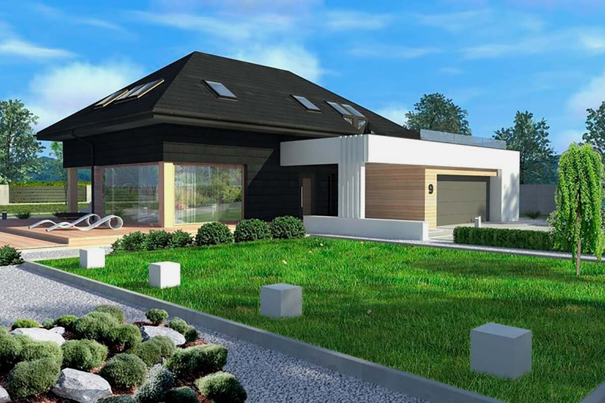 Проект загородного дома «Хорн» представляет собой двухэтажное здание в современном стиле с просторным и продуманным интерьером, рассчитанное на семью из четырех человек. Современность функциональных решений архитектора позволила реализовать на практике проект дома, дающий ощущение пространства и комфорта. Здание разделено на две функциональные зоны: дневную (первый этаж) и ночную (функциональная мансарда). Первый этаж В первой зоне есть просторная гостиная со столовой и удобная кухня с просторной кладовой. Часть стен гостиной была застеклена, что обеспечивает не только постоянный доступ к естественному освещению, но и обогащает помещение видом на сад. Стоит также упомянуть впечатляющую террасу с частичной крышей (частично крытую), которая непременно станет «летней кухней» в жаркий сезон - местом мечты для отдыха или встреч с семьей и друзьями. На первом этаже также есть кабинет с выходом на небольшую террасу, которая частично крыта. Кабинет расположен рядом с ванной комнатой, поэто