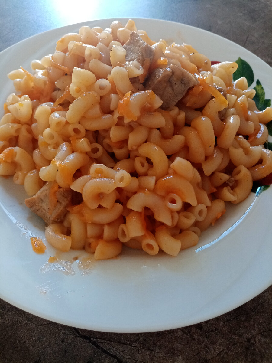 Каждому, наверное, знаком такой момент, когда приходишь вечером домой уставшим с работы, а тут еще нужно становиться и готовить ужин. На приготовление может уйти полвечера. А ведь хочется отдохнуть после тяжелого рабочего дня! А тут еще и гора посуды образовалась! Я нашла чудесный вариант для ужина, где потратите совсем немного времени, и не придется использовать большое количество посуды. Как приготовить сытный ужин с минимальными затратами? Здесь и объяснять долго не надо. К минимальным затратам можно отнести и время, и количество продуктов (менее затратные по деньгам), и кухонные грязные принадлежности. Расскажу о своем любимом быстром блюде на сковороде Макароны с мясом в томатном соусе. Ингредиенты: Пошаговый метод приготовления: Предварительно доставшее мясо из морозильника порежем на небольшие кусочки. Я в данном рецепте использую только свинину. Вы можете и другими видами воспользоваться. Если заменять, то лучше тогда куриным. Говядину не рекомендую – жариться и тушиться будет
