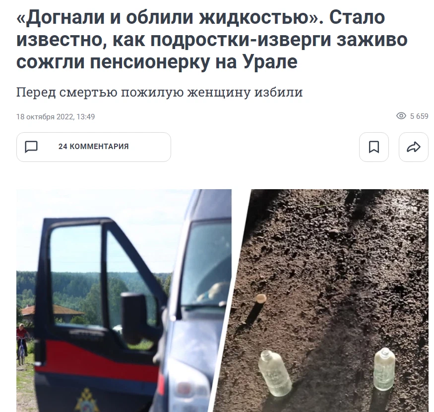 Жить пенсионерам становится всё сложнее в том плане, что если раньше подростки о них заботились, как, к примеру, тимуровцы из книги Гайдара "Тимур и его команда", то теперь уже всё иначе. Какая уж там забота и помощь? Теперь всё в разы пострашнее. Вот вам свеженький пример из Свердловской области. Там двое подростков подожгли на улицу женщину. Просто из интереса. Пенсионерка умерла. Все произошло вечером 16 октября в Алапаевске. 16-летний Дмитрий (имя изменено) гулял со своим 12-летним другом Сергеем (имя изменено). В какой-то момент они увидели идущую по улице 69-летнюю женщину. Тогда Дима предложил Серёже добежать до ближайшего магазина. Там он достал из кустов пакет с бутылками с горючей жидкостью, который он ранее там спрятал. После этого парни побежали обратно.