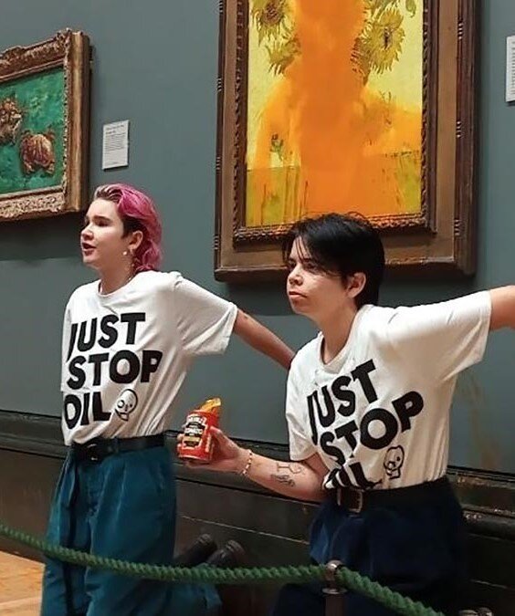 14 октября этого года, две экоактивистки Just stop oil (переводится как "Просто покончите с нефтью") вошли в выставочный зал Национальной галереи в Лондоне, вскрыли две банки томатного супа-пюре и плеснули содержимое на картину Винсента Ван-Гога "Подсолнухи", оценочная стоимость которой уходит за 70 млн. фунтов-стерлингов. После сего пефоманса, девицы нанесли клей на левую руки и приклеили себя к стене.