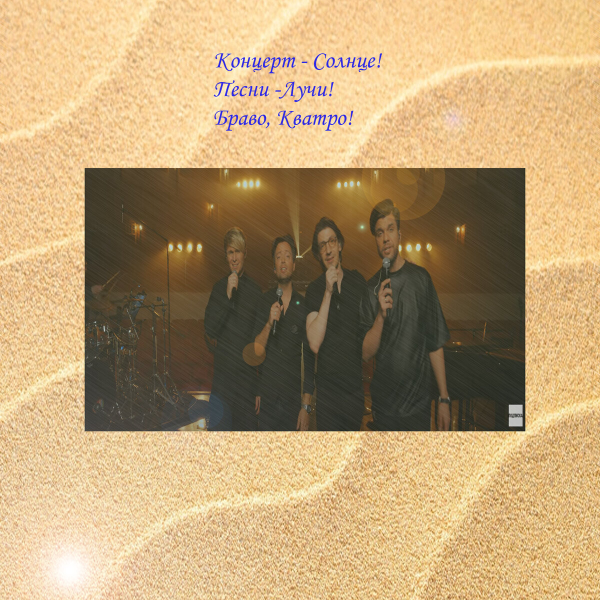 Таинственный полумрак. На сцене Кватро. Замираю я. Звонкий хор мальчиков. Чудесные музыканты. Их авторские песни, будто жемчуга мая. Разные песни, но важные. О любви, о счастье и о грусти. Драгоценная музыка точно майский дождь, теплые голоса – лучи солнца. Призывая жить в мире, чувствовать друг друга.