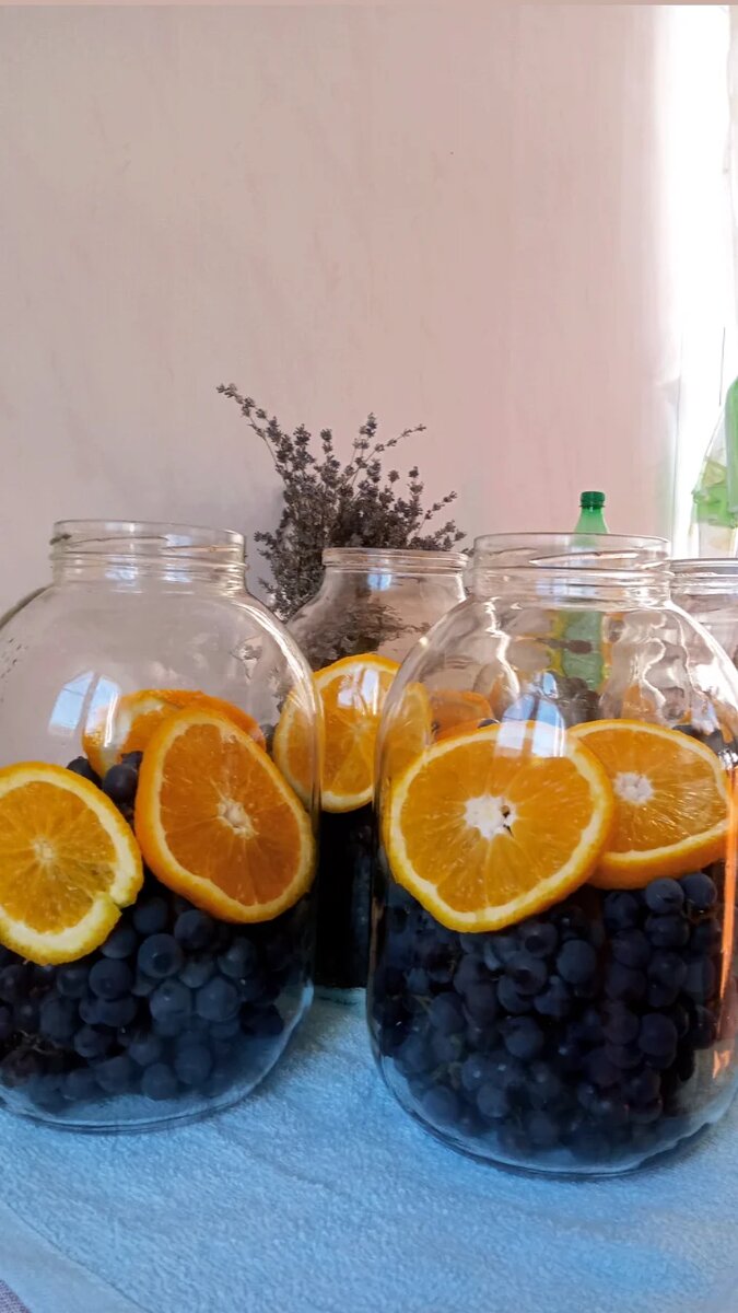 Ароматный и вкусный компот из винограда и апельсинов можно с лёгкостью заготовить на зиму. Виноград используйте любой, апельсины можно не чистить от кожуры, компот получится более насыщенным. Этот компот очень простой в приготовлении. Для начала стерилизуем наши банки и крышки. Виноград хорошенько промываем. Отделять ягоды от кисти не нужно, не вижу смысла. Да и в банке красивые кисти выглядят очень интересно. В каждую баночку я кладу по 3 кружка апельсина. Сахар кладём по вкусу, в зависимости от сладости винограда, примерно 200 грамм. Заливаем кипятком и закатываем. После того, как всё готово, я кладу банки на бочок и аккуратно их катаю из стороны в сторону, чтобы сахар получше растворился. Вот и всё, вкусный ароматный компот готов! Небольшой лайфхак: чтобы банка не лопнула, когда наливаете в неё кипяток, под дно подложите лезвие ножа 😉