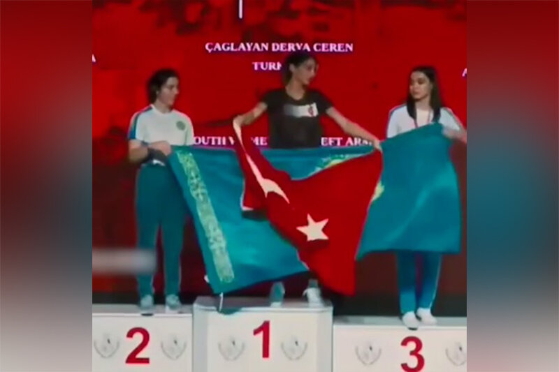 Комичное выяснение отношений произошло во время чемпионата мира по армрестлингу в Анталье. Фигурантами истории стали две представительницы Казахстана и турчанка. Казашки заняли на состязаниях второе и третье места, а потому расположились по бокам на пьедестале. У спортсменок оказался один большой флаг Казахстана, который они благополучно растянули, закрыв турецкую чемпионку Чаглаян Деря Джерен. Последней ничего не оставалось, кроме как перекинуть свой флаг поверх казахского. Началась толкотня. Зрители в итоге увидели оба флага. Российские пользователи в комментариях единодушно поддерживают чемпионку-турчанку. «А у казахов деньги только на один флаг есть? Или они реально думали, что, проиграв, можно завешивать первое место своей мануфактурой?», «Ну, турчанка победительница, ее флаг по центру однозначно. Казашки, увы, некорректно себя повели», «Заступлюсь за Турцию впервые. Скромнее надо быть, особенно проигравшим», «Говорю ж, женщины. Кстати, эти две в итоге флаг за спину завели и норм.