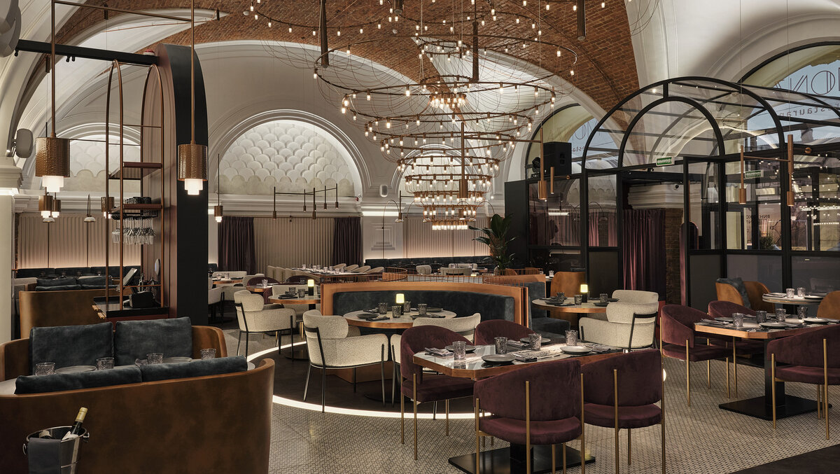 Дизайнеры Modgi Group объединили оригинальные элементы здания XVIII–XIX веков с деталями в стиле ар-деко В центре Петербурга открылся ресторан средиземноморской кухни Monza. Он расположился в здании XVIII–XIX веков, которое является памятником архитектуры. Поэтому одной из главных задач студии Modgi Group было отреставрировать исторические детали и сделать их частью новой интерьерной концепции. «В ходе работы были восстановлены кирпичные своды, колонны, арки и лепнину на капителях. Все это мы хотели не просто сохранить, а подчеркнуть декораторскими приемами», — рассказывают дизайнеры. Пространство разделено на два зала. Первый подходит для обедов и ужинов в кругу близких, а второй создан для вечеринок и мероприятий. При входе в ресторан перед гостям предстает симметричная композиция, в центре которой располагается составной диван со столами и объемная люстра. «Люстра является главным акцентным элементом в интерьере. Пятиметровая подвесная конструкция состоит из металлических кругов и с