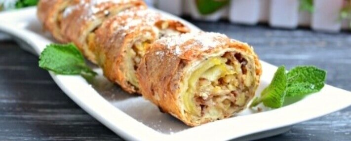 Время приготовления: 25 минут Яблоки нарезаем небольшими кубиками, смешиваем с корицей и пассеруем на разогретой сковороде около 5 минут. ________________________________________________________________________________ Полезно знать! Корица увеличивает чувствительность организма к инсулину и помогает снизить уровень сахара в крови. Безопасное количество корицы — не более 3 грамм в день! Рекомендуется начинать применение с небольших порций, примерно по 1 грамму в день. ________________________________________________________________________________ На лист лаваша выкладываем яблоки, сворачиваем в рулет, сверху смазываем взбитым желтком. Посыпаем миндальными лепестками. Выпекаем в разогретой духовке при 180°C до румяности (около 15 минут). Чтобы придать сладости, г