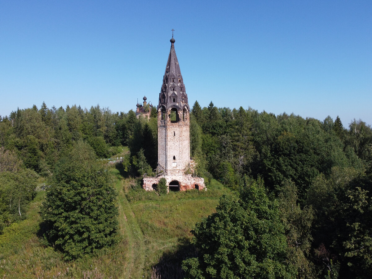 В одном из самых глухих мест Севера Костромской области есть одно очень загадочное место, которое называется урочище Высоко. Или погост Высоко. Оно находится на высоком холме, высотой 267 метров над уровнем моря. Это место является одной из самых высоких точек Костромской области. Некоторые краеведы спорят о данном холме и есть некоторые предположения об её ручном происхождении. Кто знает, может это был древний курган? Обо всём по порядку. Трудно поверить, но когда-то здесь было небольшое село. Сегодня о его существовании напоминают только 2 каменные церкви. Построенная в первой половине 18 века Воскресенская церковь почти не сохранилась. Но зато хорошо сохранилась её колокольня. Строение осуществлено в лучших традициях древнерусского зодчества с использованием элементов барокко в декоре. Поэтому она выглядит очень необычно по композиции. Отдельно заслуживает внимание то, что на колокольне до сих пор сохранился крест и почти везде уцелела обшивка. А ведь её больше 200 лет. Позади н