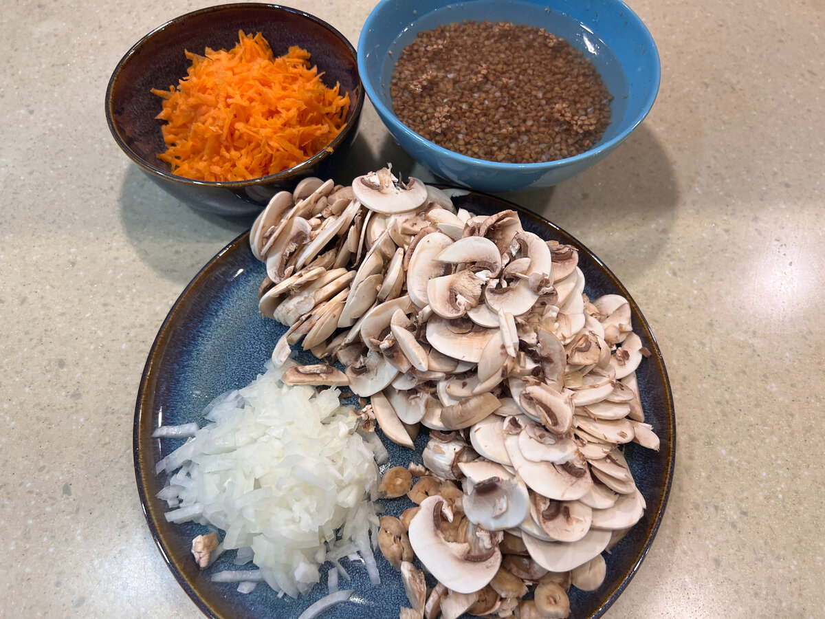 1. Гречку залить водой и оставить. Морковь потереть на терке. Мелко порубить лук. Порезать шампиньоны.