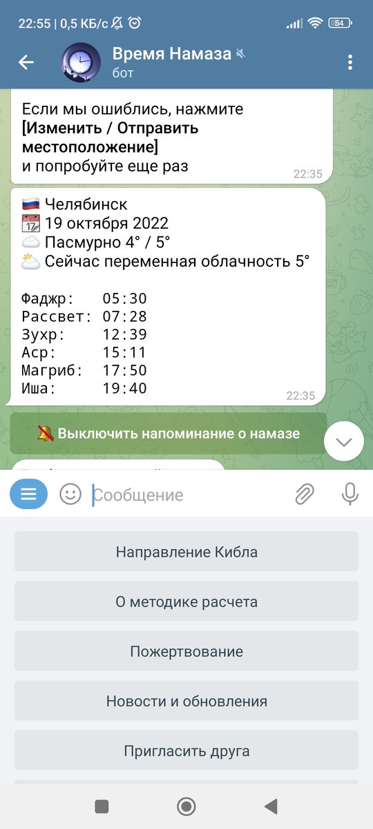السلام عليكم و رحمة الله و بركاته Ас саляму алейкум Братья и сестры хотел представить вам телеграмм бота, который сделал брат мусульманин․ Бот удобен тем что каждый человек может узнать о наступление времени молитвы в своем городе или любой указанной вами местности․ Очень удобно для тех кто в пути Бот управляется простыми командами, имея несколько функций в которых разберётся каждый Время намаза в любой указанной вами местности Направление киблы, очень удобно и быстро Так же показывает погоду в данной местности Если у вас есть предложения по развитию бота или замечания, вы всегда можете написать в обратную связь разработчику Спасибо за внимание ссылка на бота