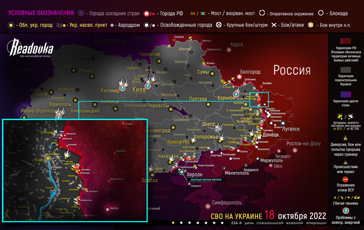 Актуальные данные за прошедший день. В центре внимания этим вечером фактически объявленная эвакуация гражданского населения с правобережной части Херсонщины. По телевидению выступил командующий СВО генерал Суровикин, рассказав о сложной обстановке на этом направлении, необходимости защитить население и готовности к самым непростым решениям, следом сделал заявление об эвакуации врио губернатора Сальдо. Ответы на вопросы: почему это не означает сдачу Херсона и почему его нельзя сдавать – дает и объясняет Readovka. Обстановка на фронтах за уходящие сутки: Купянское направление: сегодня была проведена попытка штурма российских позиций на линии Кисловка-Котляровка, остановлена артиллерией. ВСУ в результате контратаки выбиты из Горобьевки в Харьковской области. Взятие под контроль этого населенного пункта дает основание полагать, что здесь инициатива начинает переходить к ВС РФ; Артемовское (Бахмутское) направление: ВСУ перебрасывает подкрепления с западного направления в сторону Константи