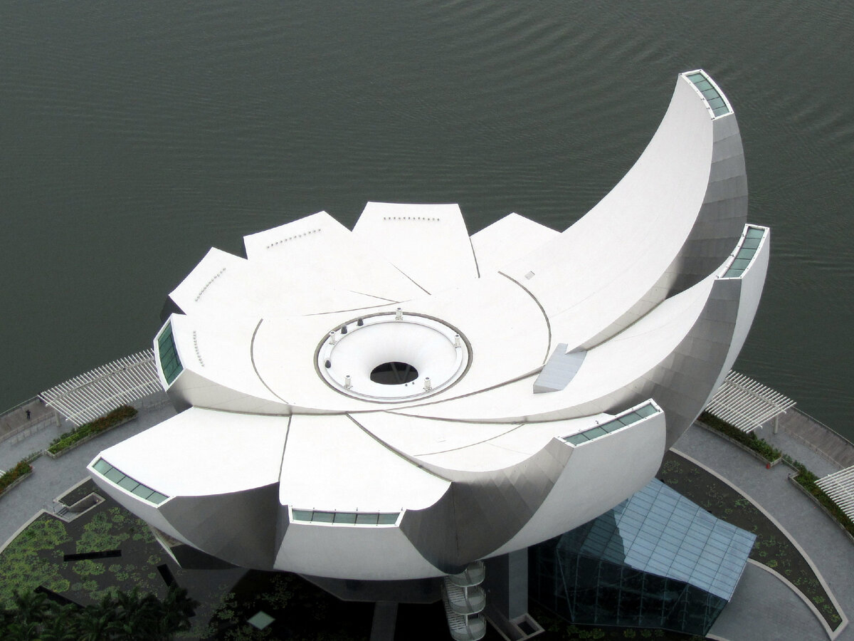 Автор этого феноменального сооружения - Моше Сафди — израильский, канадский и американский архитектор. Это первый музей в мире, который определил свою задачу так: изучение роли творческого процесса в науке и искусстве и его влияние на сознание общества. Сооружение в виде бутона лотоса является своеобразной визитной карточкой города и страны, символизируя собой гостеприимную, приветствующую ладонь Сингапура. Поговорим о самом произведении, данный музей, располагается на побережье залива Марина Бей. Это первый музей в мире, который своей задачей ставит изучение роли творческого процесса в науке и искусстве и его влияние на сознание общества. Тарелкообразная крыша здания собирает дождевую воду в направлении своего центра, через отверстие которого вода протекает во внутренний водоём музея. Асимметрическая структура музея, продуманная компанией Arup, достигает общую высоту 60 метров. Архитектурная ассамблея опирается на 10 колонн, смыкающихся корзина подобным кольцом в её центре — несущей ч
