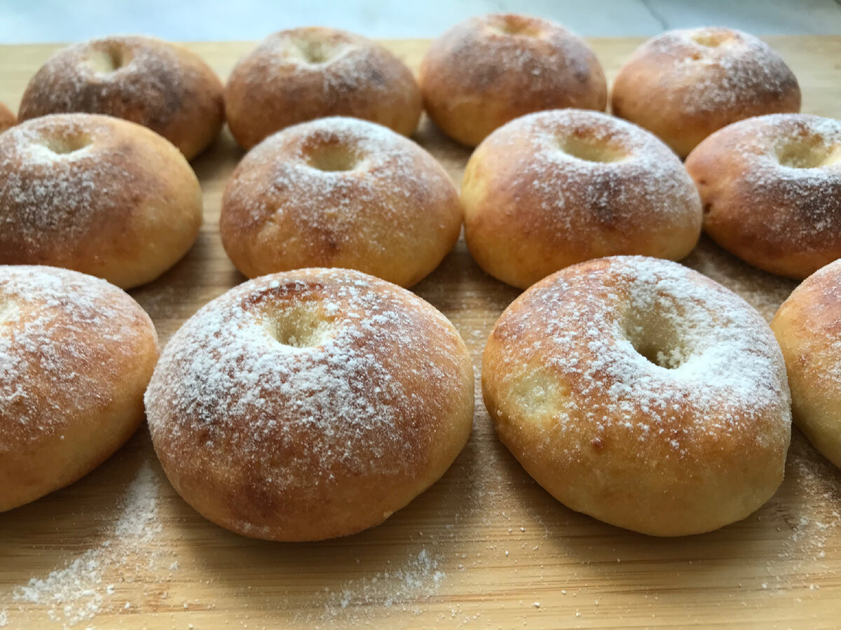 Эти творожные пончики без дрожжей готовятся быстро и просто, без жарки. Пончики получаются мягкими, воздушными и пышными. Вкусно! Они понравятся даже тем, кто творог не любит. Ингредиенты: творог—250 г яйцо — 1 шт сметана — 1 ст. л. сахар - 3 ст. л. соль - 1 щепот. мука - 200 г разрыхлитель - 1 ч. л. сахарная пудра по вкусу масло растительное - 1 ст. л. ванильный сахар - 1 ч. л. Приготовление: В миску кладу яйцо, растительное масло, сахар, ванильный сахар, соль и все перемешиваю венчиком. Добавляю творог, сметану и перемешиваю до однородности. Можно воспользоваться блендером, если в твороге есть крупинки. Добавляю часть муки, разрыхлитель и перемешиваю лопаткой. Постепенно добавляя муку замешиваю мягкое, не липнущее к рукам тесто. Тесто раскатываю и делю на 12 частей. Каждую часть округляю. С помощью насадки делаю дырочки в каждом пончике. Насадку припыляю мукой. Пончики выкладываю на противень, застеленный пергаментом и смазываю их тёплым молоком. Выпекать при Т 180 градусо