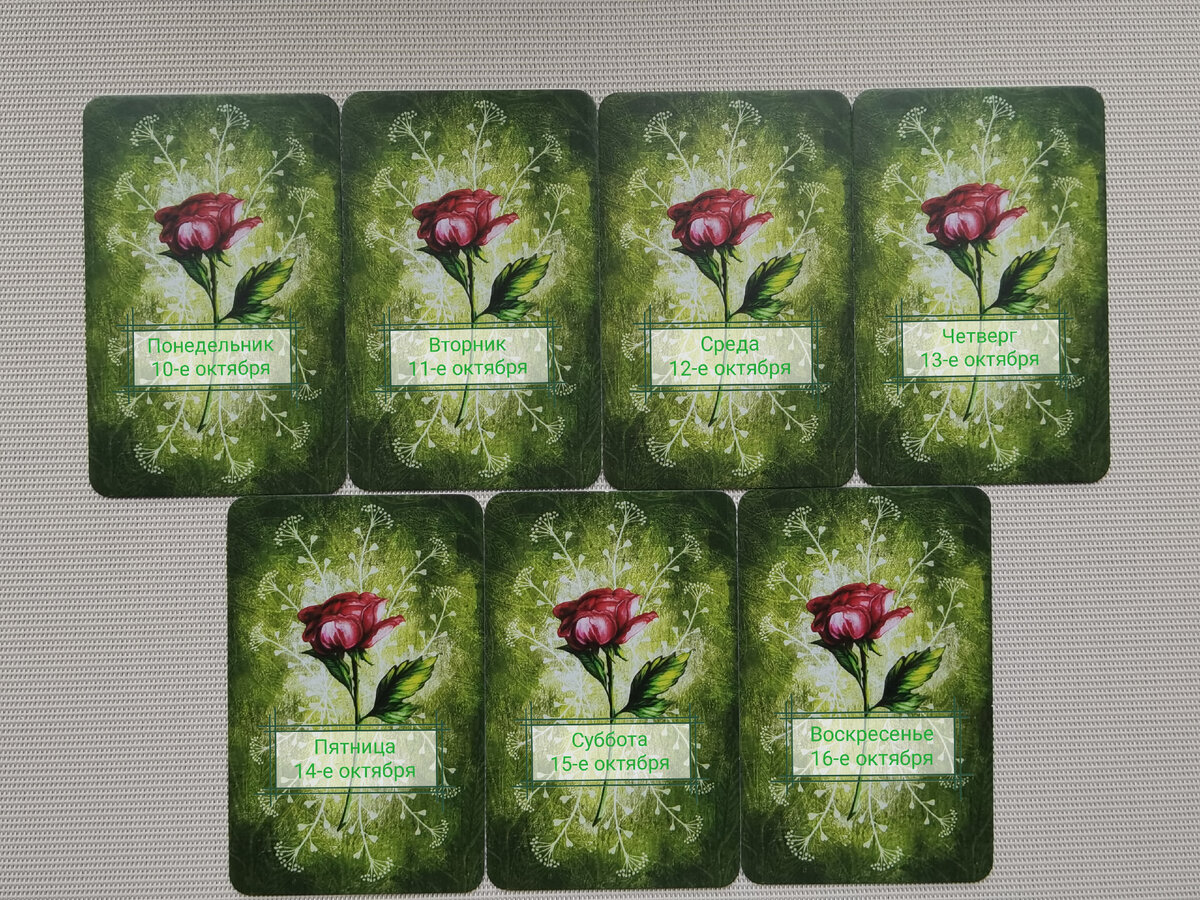 Карта дня на каждый день недели с 10-го по 16-е октября. Карта дня нам даёт подсказки как прожить свой день с максимальной пользой для себя. Приветствую всех! Меня зовут Марина. Буду благодарна вашим лайкам и комментариям. Подписывайтесь, чтобы не пропустить новые прогнозы! Итак, мы начинаем! Понедельник 10-е октября. Решение волнующего вас вопроса находится у вас в руках. И вы его найдёте. Вторник 11-е октября. День, когда вашей беспечностью может кто-то воспользоваться для обмана. Будьте бдительны. Среда 12-е октября. День, когда будет спокойно, уютно и комфортно. Четверг 13-е октября. День будет наполнен мероприятиями, общением, развлечениями, культурной жизнью. Пятница 14-е октября. Обращение в официальные инстанции, оформление официальных документов, посещение государственных организаций. Суббота 15-е октября. Общение с семьёй и близкими, семейные дела, благоприятное развитие ситуации. Воскресенье 16-е октября. День