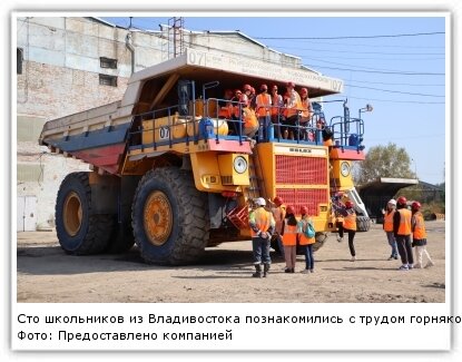 День открытых дверей для ребят из столицы Приморья прошёл в разрезоуправлении "Новошахтинское". Ученики 10-11 классов смогли увидеть, как добывают уголь на самом крупном предприятии, входящем в состав ООО "Приморскуголь", и задать любые интересующие их вопросы. Мероприятие состоялось в рамках ориентационной работы по профессиональной подготовке будущих выпускников. Приветствовал гостей главный инженер РУ "Новошахтинское" Владимир Довгушев. "Разрезоуправление занимается добычей бурого угля открытым способом. В год добывается в среднем 3,5 млн. тонн угля. Даём тепло, свет предприятиям и жителям края. У нас много современной техники: экскаваторы, автосамосвалы БелАЗ грузоподъемностью 130 тонн, бульдозеры, локомотивы. Вы увидите, что такое горняцкий труд. Мы надеемся, что кто-то из вас заинтересуется технологией освоения земных недр и захочет связать свою жизнь с угольной промышленностью. Угля на месторождении ещё много, около 250 млн. тонн, хватит работы на 70-80 лет. Будем рады видеть ва