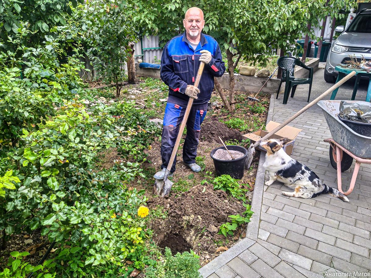 На первой фотографии Толя стоит напротив крыльца и копает ямы под пионы сортов Garden Treasure и Pastel Splendour.