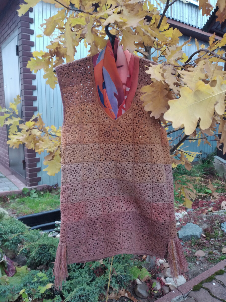 Приветствую читающих. Первый мой совместный проект в группе "мотивомания". Из мотивов не вязала. Всегда пугали узелочки и сшивание. Уж больно красивые были пледы и палантины у участниц проектов Светланы Федоровой, сказочные! Мне захотелось себя испытать, способности свои так сказать проверить. Сомнений было много на протяжении всего действа. Сейчас осталось только одно- длинна боковых нитяных вставок. Тут надеюсь на вас, что посоветуете. Я подумаю и - сделаю по -своему. Это передняя часть. Желтых,серых цветов было меньше , чем темных. Пасьянс цвета сложился так. Это соответственно задняя часть.Подгоняла по цвету плечи и низ. Остальное как получилось. Так смотрится изделие с боку. Я любительница всяких разных украшений. Это деревянное чудо привезла из последней поездки по Карелии, специально для жилета. Последнее , без чего или кого не обходятся отчеты всех участниц.. Творите с удовольствием. Всем тепла,добра и мира.