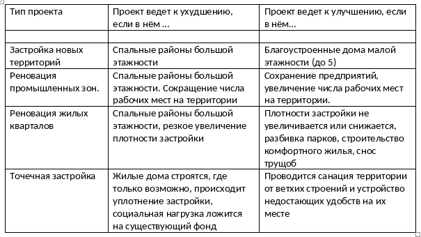 В свете дебатов, развернувшихся вокруг КРТ, даю небольшую таблицу признаков, позволяющую прикинуть, станет ли город лучше после очередного проекта. И попробуйте вспомнить, как часто случалось вам видеть за последние тридцать лет проекты, попадающие во вторую колонку. Несколько тезисов к таблице. 1) Изменения городской структуры должно вести к её улучшению. Если этого не происходит, то такое строительство городу не нужно. 2) Возможность сделать проживание комфортным зависит от плотности населения. 3) Есть предел плотности населения, после которого проблемы становятся нерешаемыми. Нельзя влить 10 литров в трехлитровую банку. 4) Нерешенные проблемы в урбанизме не приводят к немедленной катастрофе. Они компенсируются за счет других ресурсов и это позволяет делать вид, что ситуация не так плоха. Так, например, при нехватке школ вводят вторую смену. Последствия такого решения громадные, но они проявляются позже, и поэтому тут нет немедленной реакции. 5) Ошибки урбанизма приводят к катастроф
