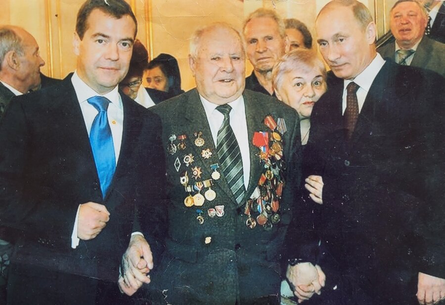 Вечером нам рассказали, как себя вести на приеме у Президента. Из семи гостей со всей страны я был единственным участником Великой Отечественной войны, остальные – пенсионеры. Попросил организаторов встречи: «Вы только меня посадите поближе к нашему руководству». Так и получилось. Сидел почти рядом с Владимиром Владимировичем Путиным и Дмитрием Анатольевичем Медведевым. Когда совещание закончилось, я попросил сфотографироваться с ними. Мне разрешили. Я взял Медведева и Путина за руки и сказал: «Вы – мои сыновья». Потом разговорились. Я рассказал, какую общественную работу веду в Рязани. Закончил свой рассказ, сказав Президенту и премьеру фразу: «Мы свою Родину защищать должны. Сегодня, завтра, всегда, а День Победы сохранить навеки».