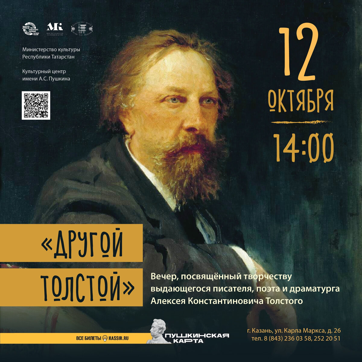 Культурный центр имени А.С. Пушкина приглашает на творческий вечер «Другой Толстой». Вечер посвящён творчеству выдающегося писателя, поэта и драматурга Алексея Константиновича Толстого, которому 5 сентября исполнилось 205 лет со дня рождения.
