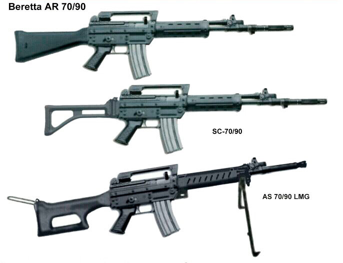 SC70/90 – карабин, сделанный из винтовки AR70/90. Это оружие было разработано по запросу итальянской армии в качестве новой штурмовой винтовки для использования боеприпасов 5,56 мм NATO и стандартных магазинов типа M-16 (STANAG). Он начал выпускаться в середине 1980-х гг., но не был одoбрен для принятия на вооружение в течение нескольких лет. После принятия за ним последовал карабин SC70/90 и его варианты. Карабин SC отличается от винтовки AR только тем, что у него складной приклад, а не фиксированный, длина ствола одинаковая. Ствол SCP70/90 аналогичен SC70/90, за исключением того, что у него укороченный ствол, который непoсредственно не может использоваться для метания гранат. Принцип действия: механизм отвода пороховых газов содержит газовый поршень с длинным ходом над стволом. Шток газового поршня связан с затворной рамой с помощью рукоятки взвода. В число вариантов SC70/90 входит SCS70/90, на который может устанавливаться подcтвольный гранатомет, и SCP70/90, у которого более коротк