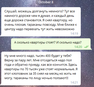 Есть у меня друг. Точнее, был, потому что теперь он живет не в двух остановках метро, а в Казахстане. И сколько я его не отговаривал 22 и 23 сентября не уезжать, он всё равно умудрился купить билет за 140 тысяч рублей и улететь. И я ведь знал, что никаких накоплений у него нет, да еще и кредит вроде как висит. Нет, всё равно поехал. Начитался Медузы и телеграм-каналов и рванул. И вот теперь пишет: Ну да, очевидно, что если 200 тысяч русских (или сколько там уже?) приехали в Казахстан, а там по сути два города есть — Алматы и Астана — то там цены взлетят. Ну, короче, все-таки одолжил немного. А то еще делов натворит всяких... Пусть живет, «прячется». Не знаю, что нужно в голове иметь, чтобы ехать в Казахстан и снимать там жилье за 70 тысяч рублей в месяц. Забавно даже.