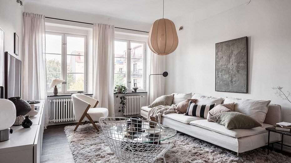 Чтобы пространство выглядело гармонично и уютно, важно выдержать единую цветовую температуру. Так, сюда не подойдет холодная белизна. Лучше брать разбавленные мягкие оттенки с розоватым или желтым подтоном: слоновую кость, молочный, сливочный, шампань. Не забудьте добавить несколько контрастных темных элементов, чтобы интерьер не выглядел слишком плоским. Такая палитра подойдет для любого стиля: от утонченной неоклассики до сканди или минимализма.