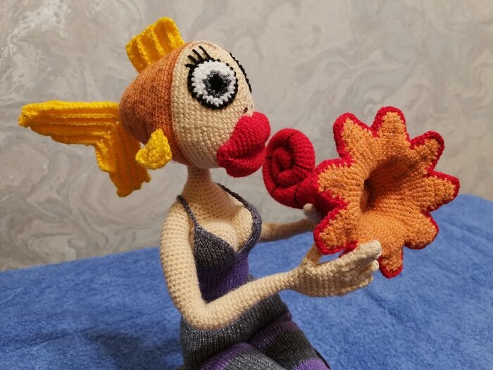 Год назад, когда кипиша по поводу "правильных" русалок даже и не намечалось, попросил меня муж связать ему русалку с сиськами. Ну ладно, с сиськами, так с сиськами... Сначала предложила ему в качестве образца русалку из "Богатырей". Сказал, что слишком жирная. Долго припоминала всех русалок, но в основном у них сиськи были не очень... А потом вспомнила настоящую армянскую русалку (муж наполовину армянин). Продумала образ, закупила ниток и... отложила все это нафиг на целый год. Летом вспомнила, что надо бы порадовать мужа и начала ковырять отложенные ниточки крючком. Работы на работе было много, перерывов на вязание было мало... Когда что-то наковыряла, пришел черед ненавистных мне спиц. Еле-еле успела доделать русалку ко дню рождения мужа. Кипишь вокруг русалок начался где-то в середине моего вязания русалки. Накаркала, наверное... Специально для фотосессии была реанимирована акула из икеи, по кличке Килька. Мачт не было, пришлось выкручиваться тем, что было. Очень "душевная" девушка.