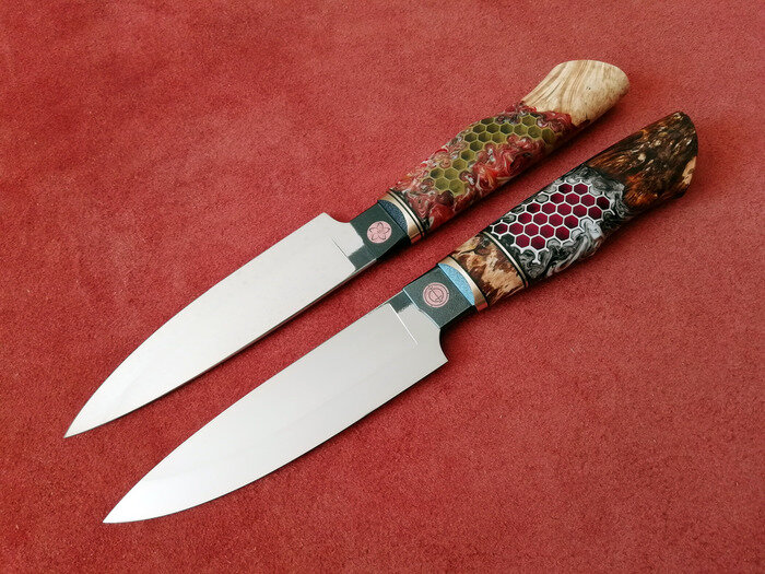 Всем привет! Недавно был заказ на пару почти идентичных кухонных универсалов с забавным материалом на рукоятях. Оба выполнены из RWL34 (62-63 HRC) и с S-образными спусками, но с некоторыми различиями. У того, что с красными сотами рукоять более массивная под мужскую ладонь и сведение чуть потолще, а желтые соты рассчитан на женскую ладонь и сведение потоньше. Финиш на клинках продольный 2500 сатин. Ну и хабаки латунные, разумеется, куда ж без них =) На рукоятках сотово-акрилово-деревянные гибриды. Заливка сотов полупрозрачная. Если б знал заранее, что хвосты будут довольно хорошо видны - украсил бы их заранее, но и так глаза не режет. Пара более детальных фото рукояток: Ну и немного лулзов напоследок: На этом усё, усем пока!