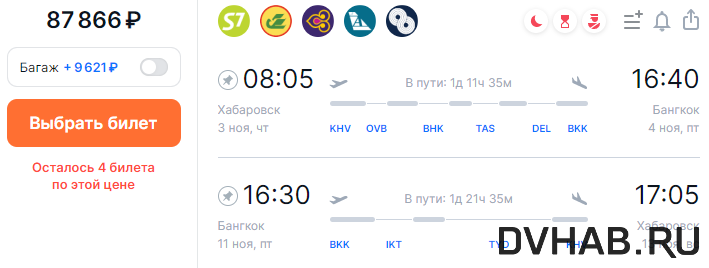 Для расчета стоимости билетов мы взяли отрезок времени с 3 по 11 ноября, а в качестве пункта назначения в Таиланде выбрали Бангкок. Прямые рейсы туда есть из Москвы, но можно добраться до королевства и окольными путями - с несколькими пересадками в разных городах и странах. Рассмотрим каждый способ подробнее. Самый дешевый маршрут За 87 866 рублей можно слетать из Хабаровска в Таиланд и обратно в указанный выше период, но здесь есть несколько нюансов. Во-первых, множество пересадок: сначала нужно будет добраться до Новосибирска, затем до города Бухары в Узбекистане. После направиться в Ташкент, следом в Дели, и, наконец, в Бангкок. Время в пути займет примерно 1 день и 11 часов. При этом в стоимость не входит багаж, а еще придется оформить визу в Индию, потому что не во всех аэропортах там есть транзитная зона. Обратный путь будет чуть проще из-за меньшего количества пересадок. Из столицы Таиланда можно добраться в Иркутск, затем - в Тынду Амурской области, а оттуда - в Хабаровск. На э