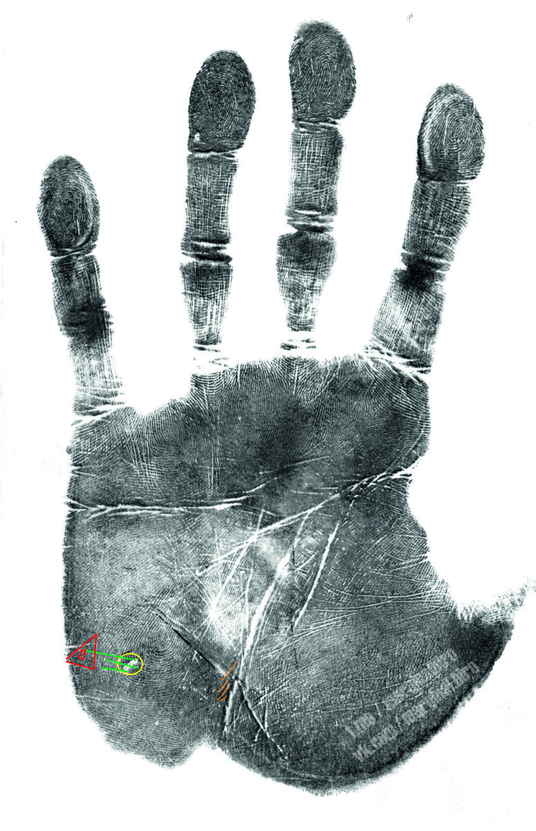 Можно ли его увидеть на руках? Можно! Перед нами оттиск левой руки мужчины на которого, в возрасте 23 лет, сожительница сделала приворот. Листаем картинку. Сам приворот выражается короткой белой линией 0,5см( в жёлтом круге ). Если приглядеться, по её центру проходит тоненькая тёмная линия. На живой руке знак выглядит как широкая, вдавленная чёрточка.