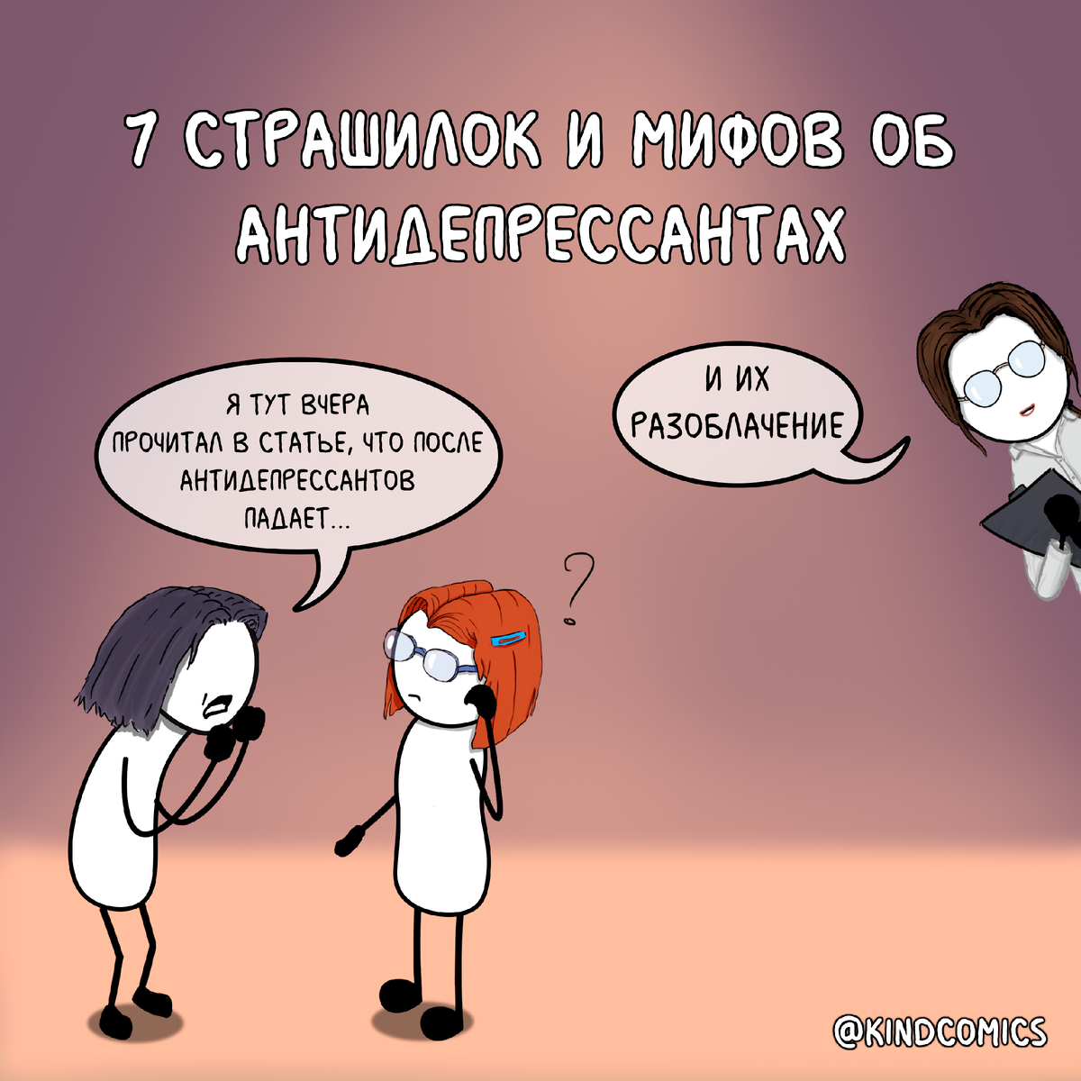 Стигматизация антидепрессантов с каждым годом становится все слабее, но до сих пор в личных разговорах и на просторах интернета о них ходят различные мифы и страшилки. Чтобы разобраться с ними, мы позвали к нам в гости психиатра Гузель Хуснуллину. Она ответила на все наши вопросы про антидепрессанты, и сегодня мы выпускаем карточки с её ответами. Надеемся, что после их прочтения ты перестанешь бояться антидепрессантов, но также запомнишь, что для того, чтобы страшилки не стали явью, важно подбирать лекарство (а также начинать и заканчивать его прием) только с психиатром. Чтобы узнавать больше о психиатрии, обязательно подпишись на Гузель в инстаграме