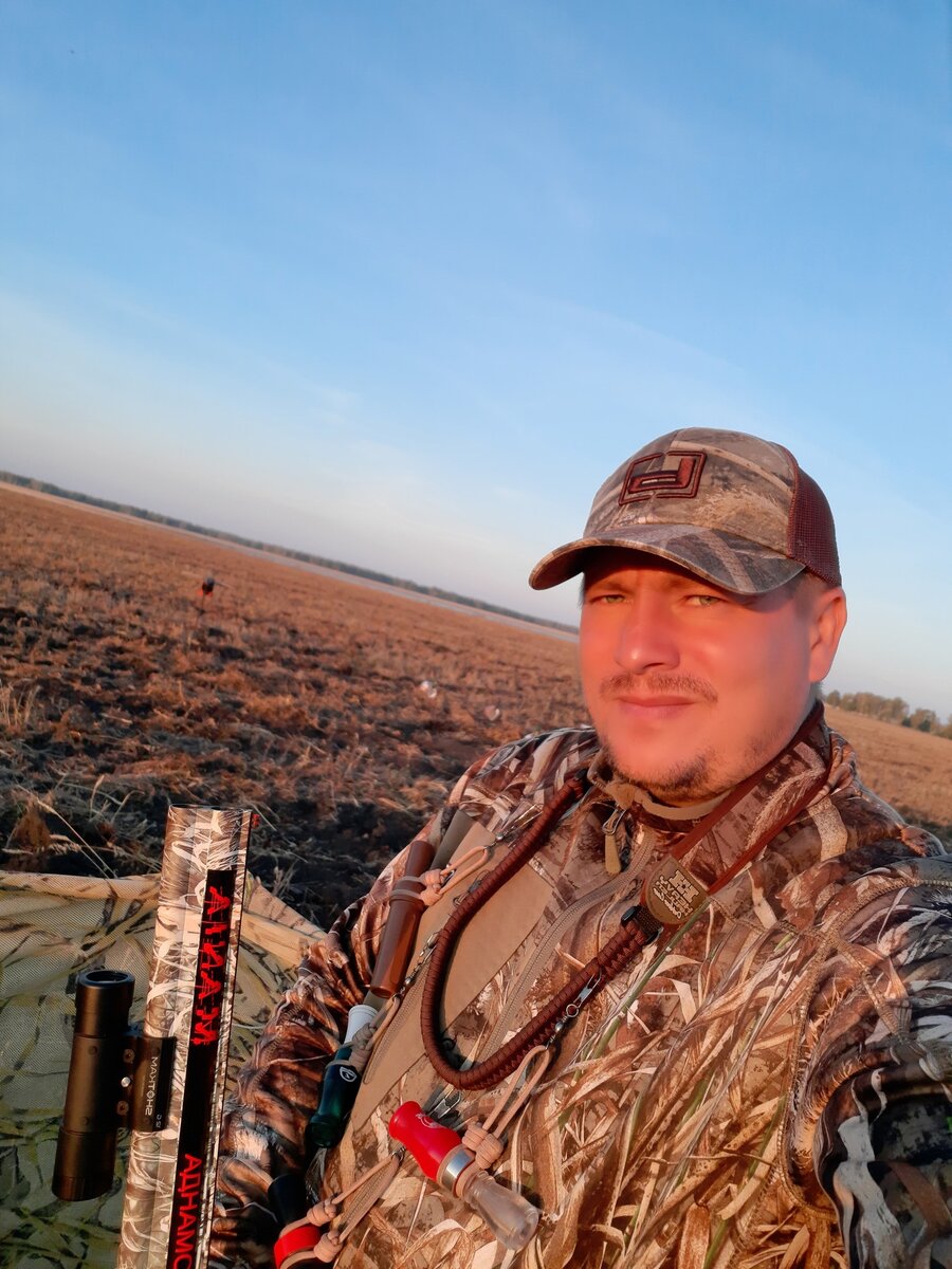 На следующий вечер мы втроём с моим отцом и братом заранее обустроились в выбранном месте. Скрадок сделали из маскировочной сети, которую натянули на границе убранного гороха и несжатой ещё пшеницы. Вообще, утка не особо боится подлетать и садиться у некоси, кустов и даже лесополос – они вполне подходят для укрытий, если само место высокое с хорошим обзором и богатым кормом. В качестве присады мы использовали специальные полевые чучела – у меня для такой охоты есть флюгеры (типа пакета с принтами на колышке, который шевелит ветром, усиливая эффект), есть фотореалистичные профили, и, конечно, махокрыл.