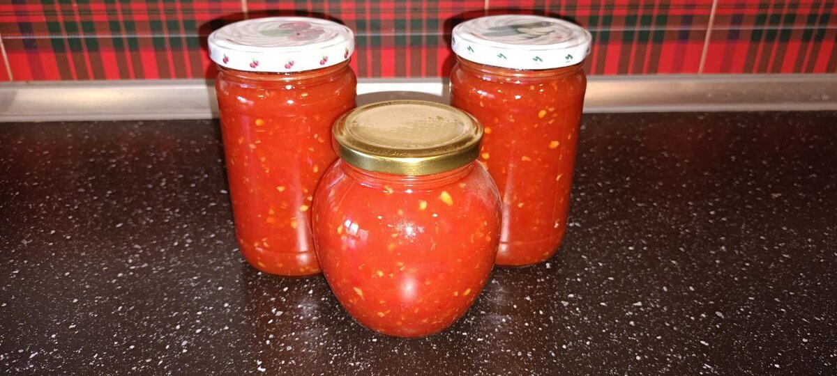 Ингредиенты: Помидоры - 3 кг Красный сладкий перец - 10 штук Острый перец - 5 штук Чеснок - 150 гр Соль - 3 столовых ложки Сахар - 300 гр Уксус 6% (можно 9%) - 250 мл Аджику по этому рецепту делаю давным-давно. Она и правда получается остренькая, но не "термоядерная". Добавляю её в зажарку для борща, а ещё смешиваю со сметаной и обмазываю кусок свинины для запекания в духовке или куриные бёдрышки, получается ОЧЕНЬ вкусно, а главное - быстро! В общем, такая аджичка незаменима))) Видео решила не снимать, так как рецепт предельно простой. Итак: Сладкий и острый перцы очищаем от семян. Чистим чеснок. Помидоры, весь перец и чеснок отправляем на мясорубку. Добавляем соль, сахар, доводим до кипения и кипятим 1 час на медленном огне. Аджика уварится и загустеет. Поле чего добавить уксус, разложить по стерильным банкам и закатать. ВСЁ!!! Обалденная аджика готова! Если понравился рецепт, поставьте пожалуйста лайк))) Комментарии тоже приветствуются)))