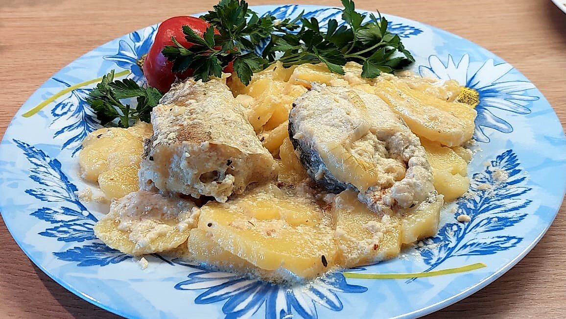И еще ее называют "королевой стола" бедняков - это треска. Хоть на каждый день, хоть гостям угощение - за милую душу все будут довольны! Это вкусное и полезное блюдо! А готовить одно удовольствие - быстро и без особых хлопот! Говорят, что треска подорожала резко, но я свою нашла у себя в морозилке. Как то врач прописал мне диетическую пищу, купила ее и вот сегодня обнаружила, что не всю ее я успела тогда съесть. Значит так было суждено - сегодня рыбный день! Итак, достала и разморозила! Рецепт трески с картофелем в молочно -сметанном соусе (можно любую другую белую рыбу): рыба - тушка порезанная или филе картофель (или любые другие овощи) сметана 150 мл 20% луковица 3 шт масло подсолнечное - 4 ст.л молоко 300 мл майонез -2 ст. л соль, приправа "Прованские травы" по вкусу Лук нарезать полукольцами и слегка обжарить на масле Положить сверху на лук кусочки рыбы Залить молоком до поверхности рыбы, на рыбу выложить сметану, смешанную с майонезом. Тушить в сковороде под крышкой 10 ми