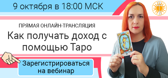 Говорят, что идеальная жизнь - это когда любимое хобби делает мир вокруг лучше и со временем превращается в любимую работу. ❓Вы знаете, как превратить хобби в занятие, которое приносит доход? 👍 Приходите на бесплатный вебинар. Я расскажу вам, как гадание на картах Таро меняет жизнь людей, а еще о том, где найти дополнительный источник заработка. ⏰ Встречаемся 9 октября года в 18:00 по МСК. В прямом эфире вы поймете: 🔸 как легко изучить Таро, если вы только начинаете с ними работать; 🔸 как карты помогают людям менять жизнь к лучшему; 🔸 и наконец, как получать дополнительный доход от гадания. ‼️ Обязательно приходите, задавайте вопросы и получайте ответы прямо в эфире. 📲 Поставьте напоминание в телефоне. Оно подскажет вам, что уже пора идти на вебинар 😉 ❇️ Когда вы поймете силу и возможности карт, сможете сделать Таро своей профессией. ЗАРЕГИСТРИРОВАТЬСЯ