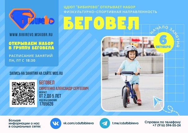Центр творчества "Бибирево" открывает набор детей с 2 до 5 лет в секцию "Беговел" Запись на занятия на сайте mos.ru: 👉🏻 Беговел - https://vk.cc/chb4iV Телефон для справок: +7 (916) 594-55-24 Занятия проводит педагог дополнительного образования Александр Сиротенко Добро пожаловать в #ЦДЮТБибирево