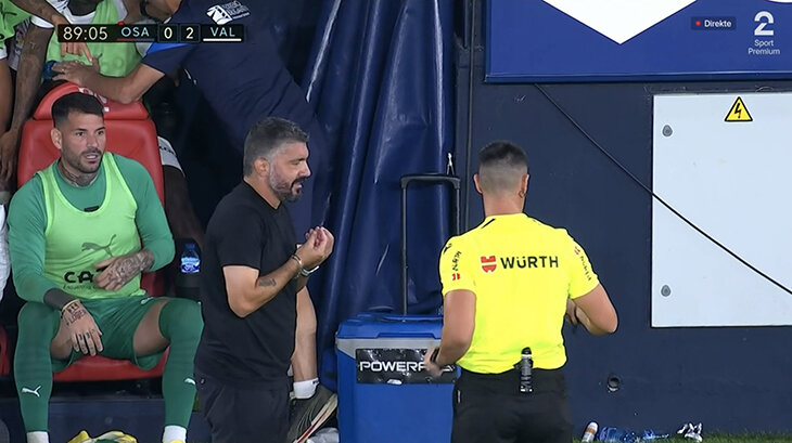 Цель – 40 очков. «Валенсия» и «Осасуна» подарили один из самых ярких и эмоциональных матчей в новом сезоне Ла Лиги. Три удаления и незабитый пенальти Эдинсона Кавани смешались с голом последней надежды от доигрывавших уже в меньшинстве хозяев. «Валенсия» выиграла 2:1 – и Гаттузо считает эти три очка чуть ли не вымученными. Главный герой – защитник Муктар Диакаби. На 54-й минуте он забил второй и вывел гостей вперед – после этого «Валенсия» подсела и удерживала результат. Все шло спокойно, но на 84-й Муктар решил сфолить и схлопотал ненужный горчичник. Рино решил перестраховаться и сразу заменил Муктара. Защитник не сдержал эмоции. Судья Мигель Арьяс такое рвение не оценил – и он удалил уже ушедшего с поля игрока. Сначала Гаттузо спокойно просил не наказывать Муктара. Потом увидел красную. Резко закипел и пошел разбираться. Инвентарю «Валенсии» не позавидуешь. Кому-то лучше не появляться на тренировках в ближайшие дни. «Я разозлился на Диакаби. Четыре красных карточки в восьми матчах ка