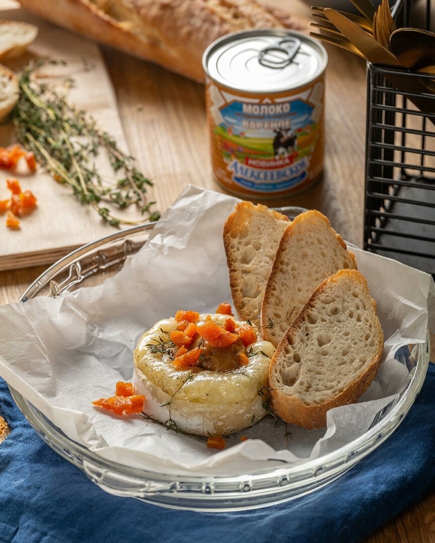 Хлеб – для подачи. Способ приготовления: 1. Срежьте у головки сыра бри верхнюю корочку. 2. Поместите сыр в форму для запекания. Присыпьте черным перцем. А сверху выложите веточки тимьяна. Запекайте 10 минут при 180°С в духовке. 3. На теплый бри выложите ложку вареного сгущенного молока и кусочки кураги. 4. Сразу же подавайте к столу с ломтиками хрустящего хлеба. Приятного аппетита! #алексеевское #сгущенноемолоко #варенка #сгущенка #бри #закуска #сырбри