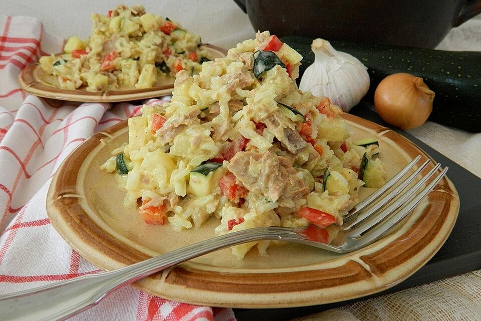 Спорить с тем, что «Оливье» наше все, я не буду (запинают), но скромно и очень тихо сообщу — салатов, как мы все знаем, существует огромное количество. Причем многие готовятся из весьма неожиданных ингредиентов., а получаются…вкусными. Сегодняшний салат мне был представлен как «индийский». Но я его зову проще — рисовый с тунцом и карри, потому что «индийскость» в нем, по моему мнению, исключительно наносная, и рожден он кулинарным гением отечественных кулинаров. Итак, берем: Как готовим: Рис отвариваем — нам нужен рассыпчатый — и ставим остывать. Лук и чеснок чистим, лук нарезаем мелкими кубиками, чеснок — рубим. Кабачок, сладкий перец и ананас режем кубиками покрупнее, желательно — одного размера. Разогреваем масло, отправляем в него кабачки — обжариваться до готовности. Когда они практически «дойдут», добавляем в сковороду лук и чеснок, жарим до того момента, как лук станет приятного золотистого оттенка. Даем овощам остыть. Смешиваем рис с пережаренными овощами, ананасом, с