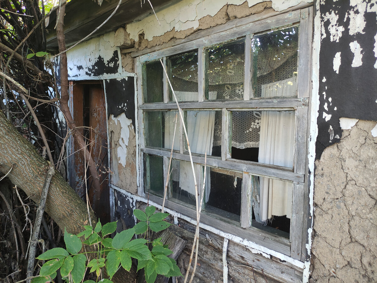 Всем привет! Сегодня хотел бы показать заброшенный дом, в который нам удалось пробраться не без приключений. Дело в том, что прямо у входной двери выросло уже довольно-таки большое дерево, так вот мы между ним и дверью еле пролезли. Показываю дверь, она действительно была открыта, на ней были кованые затворы. Скорее всего, дом был построен еще до революции. Это можно понять по технологии его строительства. Каркас был обит специальной деревянной рейкой, а затем все это мазалось глиной. Такие дома еще в старину называли "Мазанка". На фото выше отчетливо видно из чего сделаны стены дома. Заходим в сени и видим, что там даже остался Советский кухонный стол, какой был, наверное, в каждом деревенском доме. На окне даже остались занавески. Окна были завешены, поэтому в доме было темно. На потолочной балке вбили гвоздь, на нем висела уже потрепанная временем белая кепка. Внутри стола уже ничего не было, а на столешнице лежали деревянные ложки. Это моя болезнь, обожаю деревянные ложки с хохломс