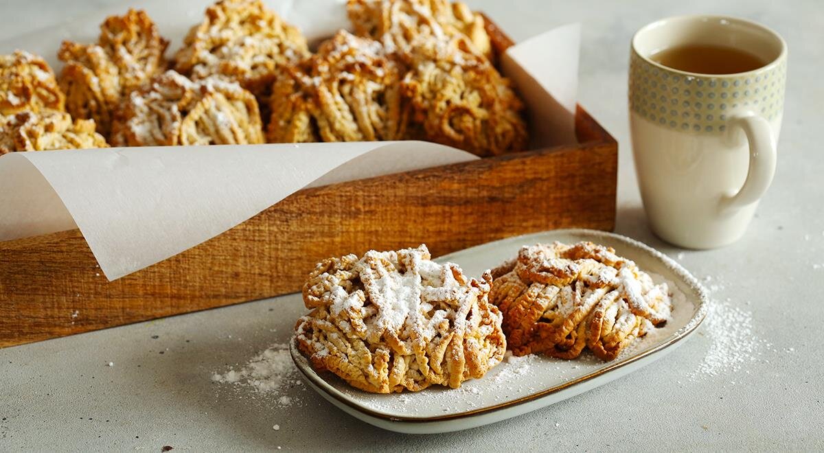 Для этого смешайте муку, соль и соду в одной посуде, а затем просейте через сито. Сливочное масло нарезаем кубиками и оставляем на 5 минут при комнатной температуре. Это нужно что бы масло растаяло. Теперь добавляем сливочное масло к нашей смеси с мукой и тщательно перемешиваем руками до получения крупной крошки теста. Яйца взбиваем в отдельной посуде добавив туда порцию сахара и молотой корицы. Далее смешиваем нашу мучную крошку и взбитые яйца. Тщательно замешиваем тесто. После чего оборачиваем тесто полиэтиленовым пакетом и убираем в холодильник на 50-60 минут. Когда тесто будет готово, достаем его из холодильника и разделяем на более мелкие кусочки (примерно по 40-50 грамм). Эти мелкие кусочки пропускаем через мясорубку и сразу ловим рукой перекрученное тесто, тем самым отделяя и формируя форму. Это и будет нашим печеньем.
