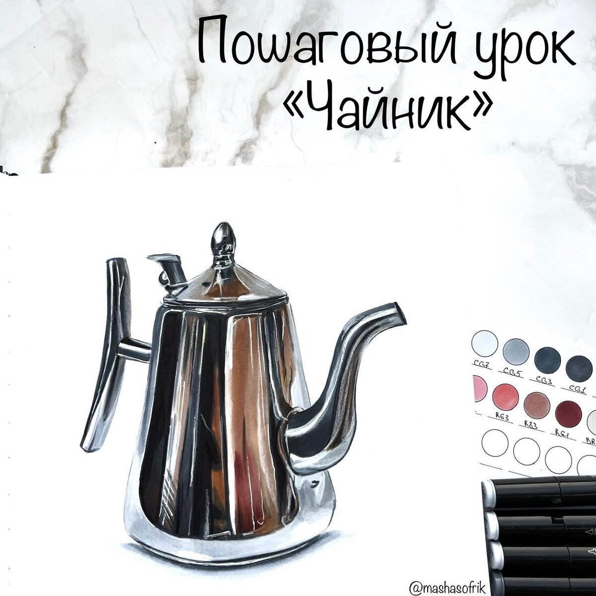 В этом году у меня определенно сезон металлических чайников. Уже не помню, какой этот по счету, а вот до стеклянных пока не доходят руки. ⠀Поэтому предлагаю вам порисовать сегодня еще один серебряный 🫖. ⠀На этот раз рисую маркерами sketchmarkersclub 1. Делаю карандашное построение. Рисую вертикальную линию по середине и стараюсь сделать чайник максимально симметричным. В карандаше намечаю сразу носик, ручку и крышку, внутри отделяю светлую будущую часть металла ⠀ 2. Начинаю со светлого серого оттенка CG9, которым закрашиваю светлые области. В чайнике отражается всё вокруг находящиеся, поэтому есть бежевые пятна. Я их закрашиваю BR14 ⠀ 3. Добавляю в пятна узора более яркий желтый Y13 и растушевываю BR14. Серые части чуть-чуть утемняю следующим серым CG7 ⠀ 4. В узор ввожу Y64, R63, R43 (пытаюсь общие пятна наметить тех цветов, что я вижу на референсе), а чайник продолжаю утемнять еще более темным серым CG5 ⠀ 5. Использую самые темные оттенки, чтобы следующими цветами сглаживать гран