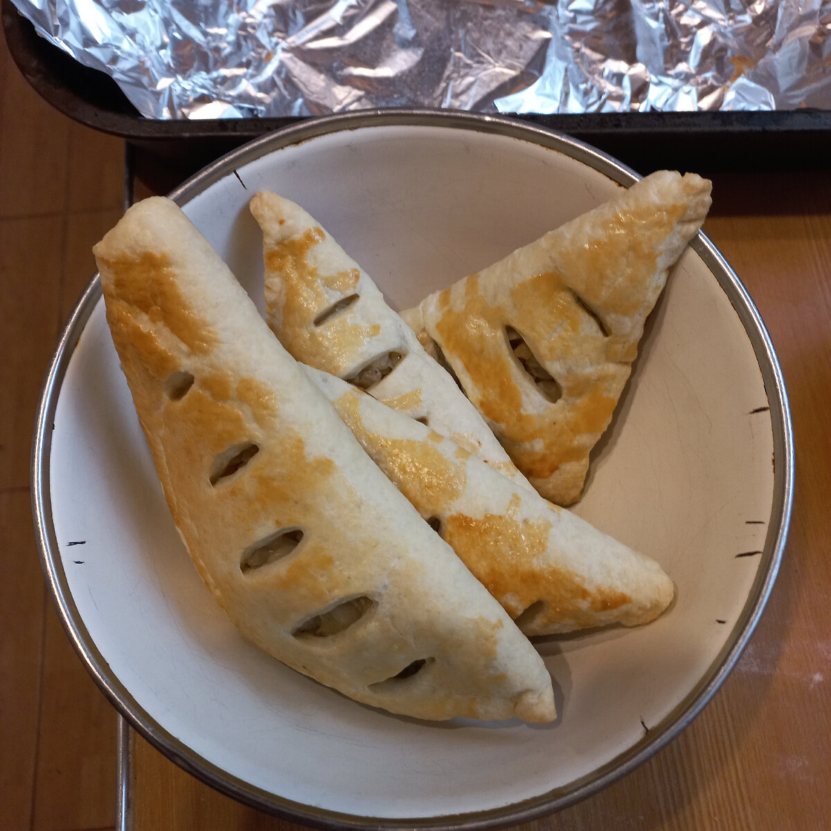 Легко и быстро. Тесто тонко раскатать. Нарезать на квадраты. Сделать на одной половине надрезы. На другую половину уложить начинку. Тушёная капуста, картофельное пюре, обжаренный мясной фарш. Если хотите сладкие пирожки, то и начинку сделайте сладкую. Яблоки, груши мелко нарезать. Или слегка отварить, сделать из них пюре. Сложить квадрат по диагонали. Слегка смазать края взбитым яйцом. Залепить края. Прижать вилкой. Сверху пирожки смазать яйцом. В моей духовке пеклись 20 минут при 190°. #пирожки #пирожки в духовке #пирожки с капустой #рецепты #кулинария #слоеное дрожжевое тесто