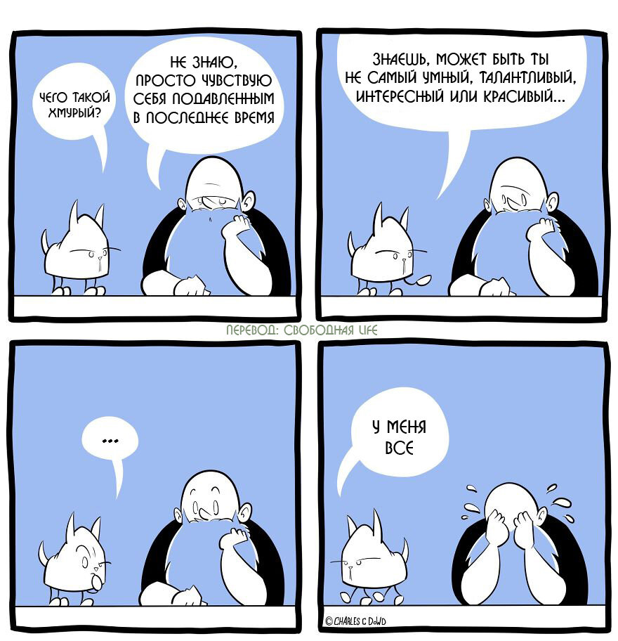 Сегодняшняя подборка комиксов называется «Большой толстяк Чарли», и она полуавтобиографическая. Эти комиксы созданы в юмористической и саркастической форме, они рассказывают о личной борьбе одного человека с трудностями повседневной жизни. Мне удалось узнать, что автора зовут Чарльз Дауд, он писатель и иллюстратор из Балтимора. Специализируется в основном на динамичных приключенческих боевиках. Он выпустил несколько книг, а также создает комиксы. У Чарльза есть жена, двое детей, бульдог, чихуахуа и три кошки! Чарльз открыто говорит о проблемах, которые возникают из-за его пищевых привычек. "Я хотел рассказать о своей борьбе, а так как смех - это лучшее лекарство, то я начал полуавтобиографический онлайн комикс, который назвал Большой толстяк Чарли", - говорит автор. Работа над этими иллюстрациями стала для Чарльза терапевтической, ведь помогает ему справляться со своими трудностями. Подписчики пишут ему, что им очень знакомы эти ситуации. Автор благодарит всех, кто читает его комиксы