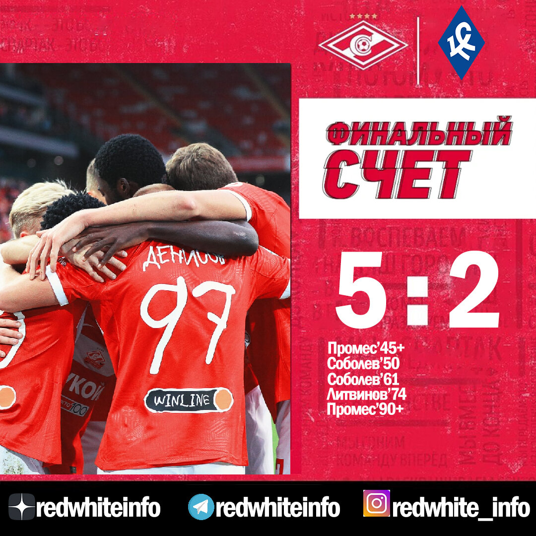 👉 Московский «Спартак» со счетом 5:2 одержал победу над «Крыльями Советов». 👀 До 45-й минуты красно-белые уступали со счетом 0:1, после чего свой 10-й мяч в 12-ти турах забил Квинси Промес. 📄 Сразу же после первого тайма отличился Александр Соболев, который вывел москвичей вперёд. Позже самарцам удалось сравнять счет, но Соболев с передачи вышедшего на замену Зиньковского снова вывел «Спартак» вперёд. 🔝 На 75-й минуте уже отличился Руслан Литвинов, после подачи штрафного исполненного Квинси Промесом. Итог подвел тот же Промес, забив 11-й гол в 12 турах РПЛ 📌 Итоговая победа позволила красно-белым набрать набрать 25 очков и выйти на чистое второе место в турнирной таблице.