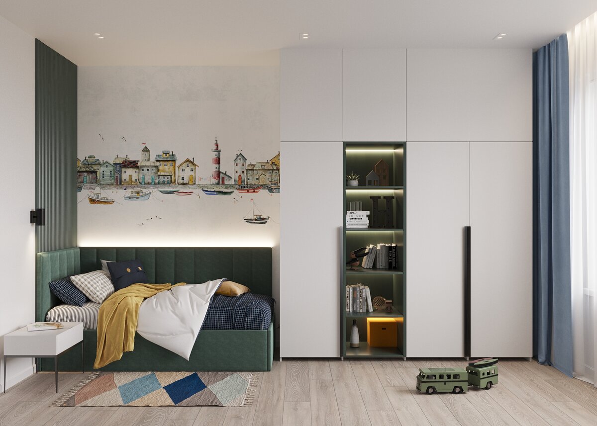 Детская комната сложна тем, что в ней желательно уместить разнообразный функционал: - зона отдыха - зона учебы и занятий - зона спорта - зона для игр - зона хранения одежды - зона хранения игрушек - просто свободное пространство - зона для творчества Для каждого возраста ребенка есть свои потребности, меняется мебель и сам функционал. Существуют следующие градации возрастов: 0-2. Новорожденный. когда ребенок еще спит в спальне родителей или в люльке, комната больше выполняет роль спальни, комнаты для кормления, гигиенических процедур и игр. 2-6 лет. Садик. чаще всего ребенок уже спит в своей комнате и в своей кровати. 6-12 лет. Младшая и начало средней школы. возраст начальной школы, когда еще хочется много играть, но при этом уже достаточно серьезная школьная жизнь + дополнительные кружки и занятия. 12-18 лет. Средняя и старшая школа. Самый главный приоритет в планировании детской комнаты является безопасность и пространство. Стоит избегать острых углов, в отделке желательно приме