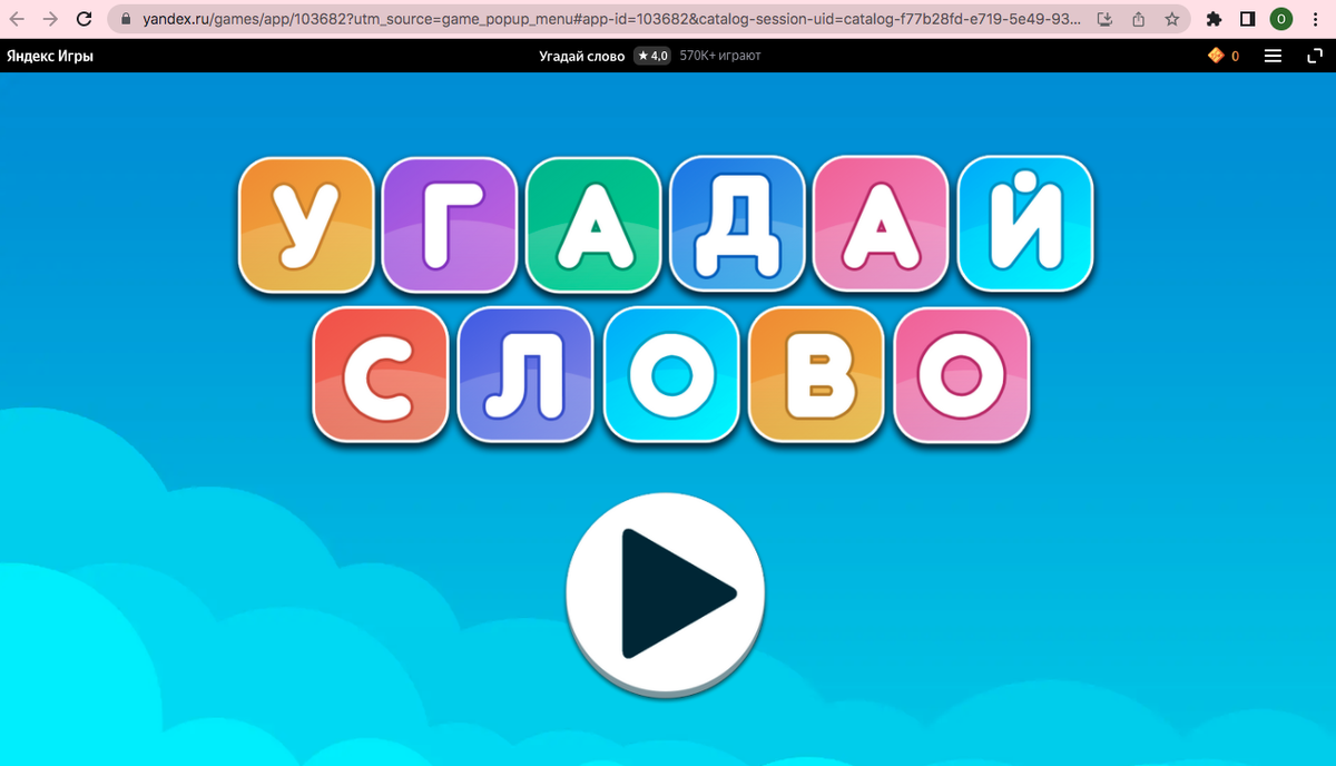 Угадай слово Отличная игра с прекрасным музыкальным сопровождением! Отвлечёт вас от повседневных забот и потренирует ваш мозг, а также увлечёт ваших детей. Игра заключается в том, чтобы собрать слово по данному определению из предложенных перепутанных букв. Вообще, на Яндекс.Игры большой выбор на любой вкус. Отдыхайте на здоровье!