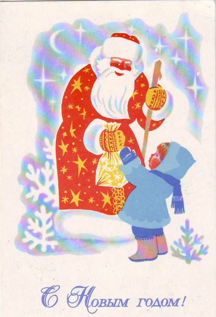 Эти открытки были не менее популярны, чем работы Зарубина, их тоже узнавали, искали, с радостью отправляли по почте родным и друзьям. И художник А. Любезнов безусловно входил в число авторов открыток, чьи работы нравились очень и очень многим. Его Дед Мороз с пакетом сладких подарков, которой он протягивает ребенку, был воплощением праздника, когда не терпелось открыть подарочную упаковку и съесть еще холодную от мороза конфету. Или найти яркий, ароматный мандарин. Снегурочка в возке на открытке Любезнова напоминает сказочную королевну с меховой муфтой в руках. А Дед Мороз - лихого ямщика. Спорт был той темой, которой уделяли внимание, поэтому среди подарков дети находили спортивный инвентарь, а сумка у мальчика с надписью "Москва 1980" говорила о скором приближении Олимпиады. Чудесный олимпийский мишка тоже попал на новогодние открытки. Олимпиада дала возможность новых знакомств, и поздравления на всех языках летели по всему земному шару. Некоторые открытки 70-х годов у Любезнова бо