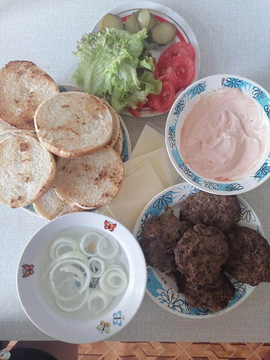 Приготовим вкусные бургеры в домашних условиях. ИНГРЕДИЕНТЫ ПРИГОТОВЛЕНИЕ 1.Подготовим все ингредиенты. Лук нужно нарезать кольцами и замариновать в уксусе. Помидоры и огурцы нарезаем кружками. Для соуса смешиваем кетчуп и майонез. Булочки разрезаем пополам и обжариваем на сковороде без масла до румяной корочки. В фарш добавляем соль и перец по вкусу, формируем котлеты и обжариваем. 2. Начинаем собирать наш бургер. Булочки смазываем соусом. На нижнюю половинку булочки кладем лист салата, помидор, лук, огурец, котлету, сыр. Накрываем второй половинкой. Наш бургер готов! Вкуснее, полезнее и дешевле, чем покупной. Приятного аппетита!